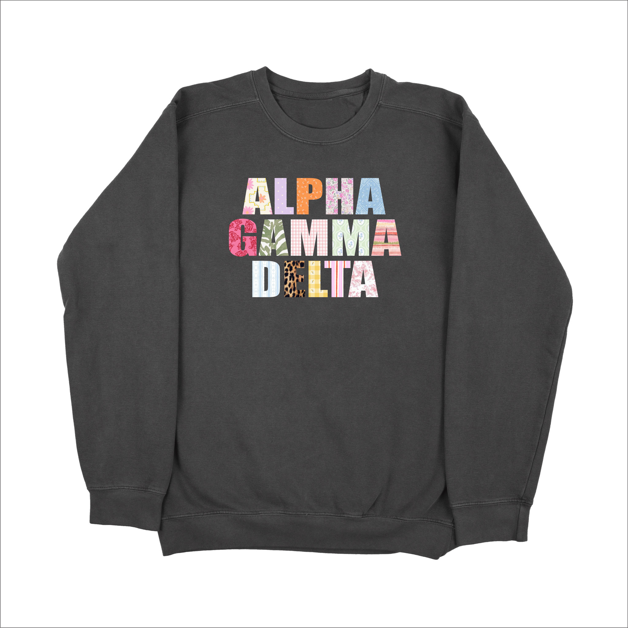 This one’s for the girls who love a little pattern play 💕 Our Scrapbook Sweatshirt features a bold and playful mix of prints that spell out your sorority in the cutest way possible. Each letter pops with its own unique vibe—think florals, animal print, gingham, and more.
