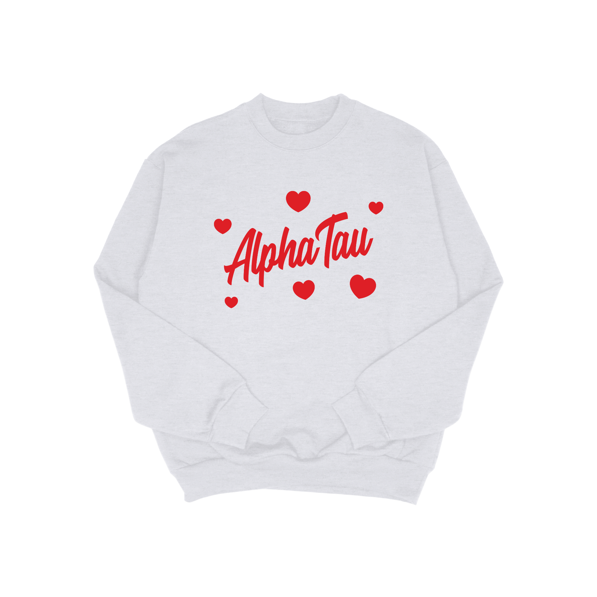 Celebrate sisterhood the sweetest way. This custom crew features your sorority letters surrounded by playful red hearts — a simple, adorable reminder of the love, laughter, and lifelong friendships you share.