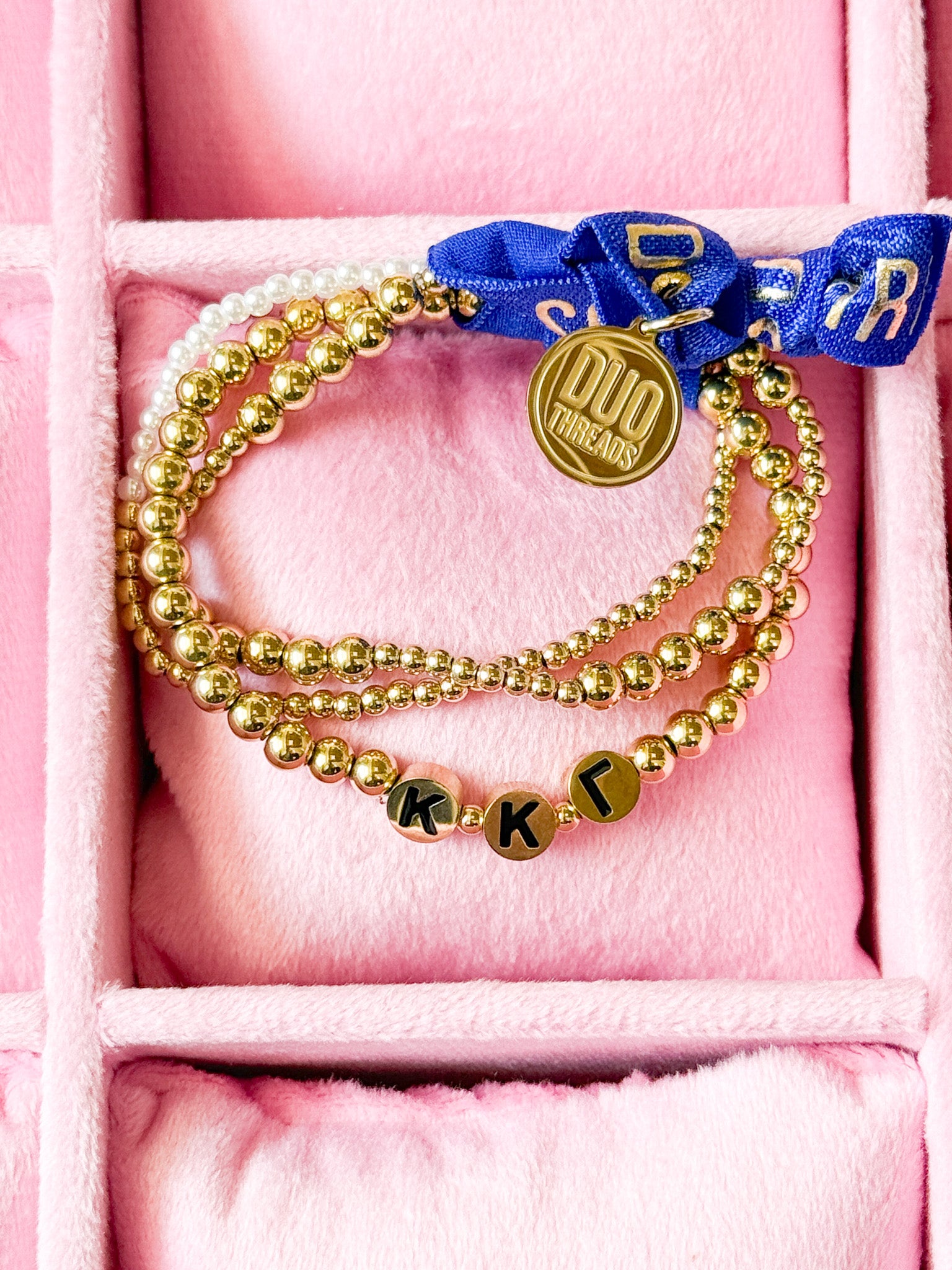 Classic. Timeless. Always on. The Everyday Gold Bracelet Stack features a curated mix of gold beaded styles designed to elevate your daily stack—no matter your outfit or agenda. With three stretch-fit bracelets (including your sorority letters front and center), this set adds the perfect touch of shine whether you're headed to class, brunch, or Big/Little reveal.