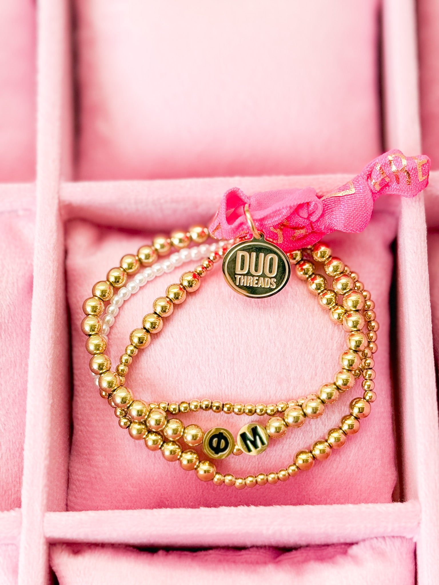 Classic. Timeless. Always on. The Everyday Gold Bracelet Stack features a curated mix of gold beaded styles designed to elevate your daily stack—no matter your outfit or agenda. With three stretch-fit bracelets (including your sorority letters front and center), this set adds the perfect touch of shine whether you're headed to class, brunch, or Big/Little reveal.
