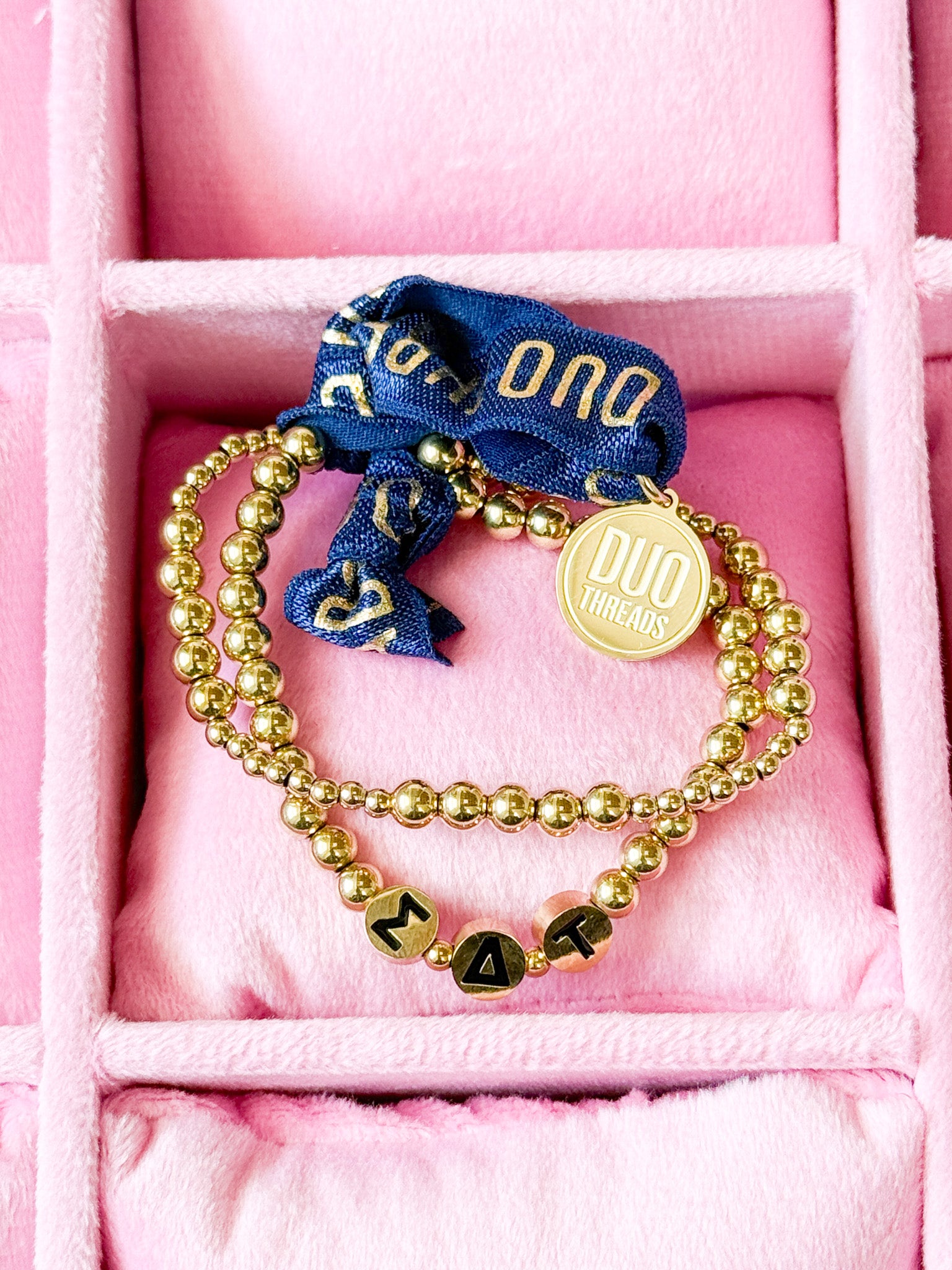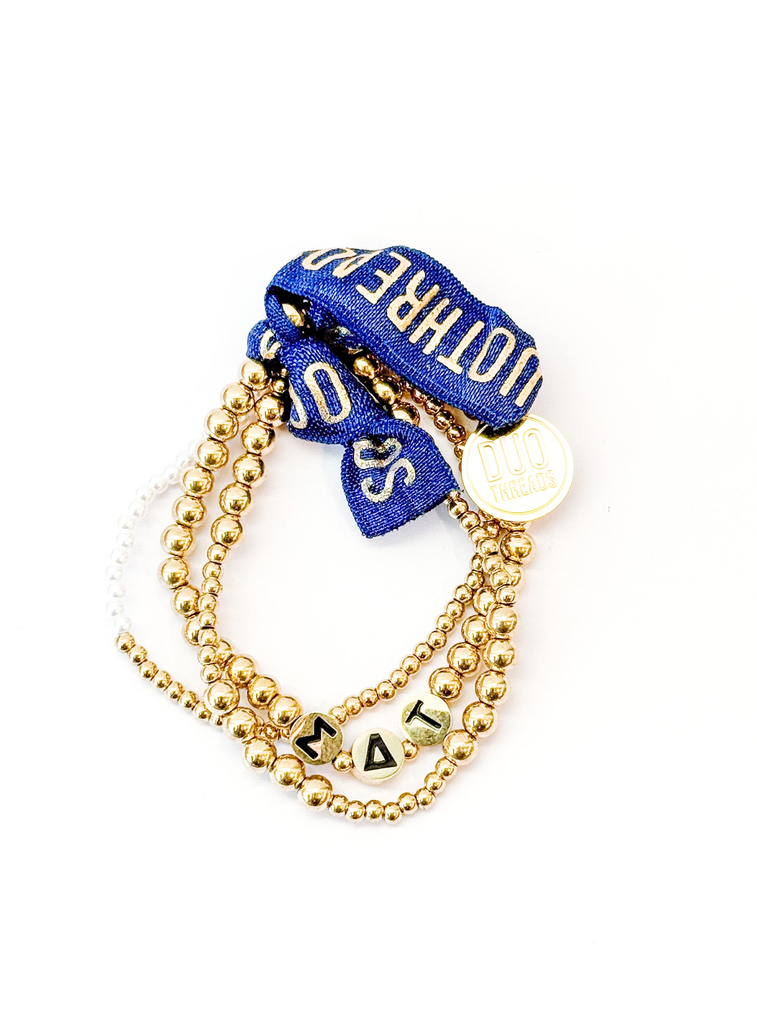 Classic. Timeless. Always on. The Everyday Gold Bracelet Stack features a curated mix of gold beaded styles designed to elevate your daily stack—no matter your outfit or agenda. With three stretch-fit bracelets (including your sorority letters front and center), this set adds the perfect touch of shine whether you're headed to class, brunch, or Big/Little reveal.