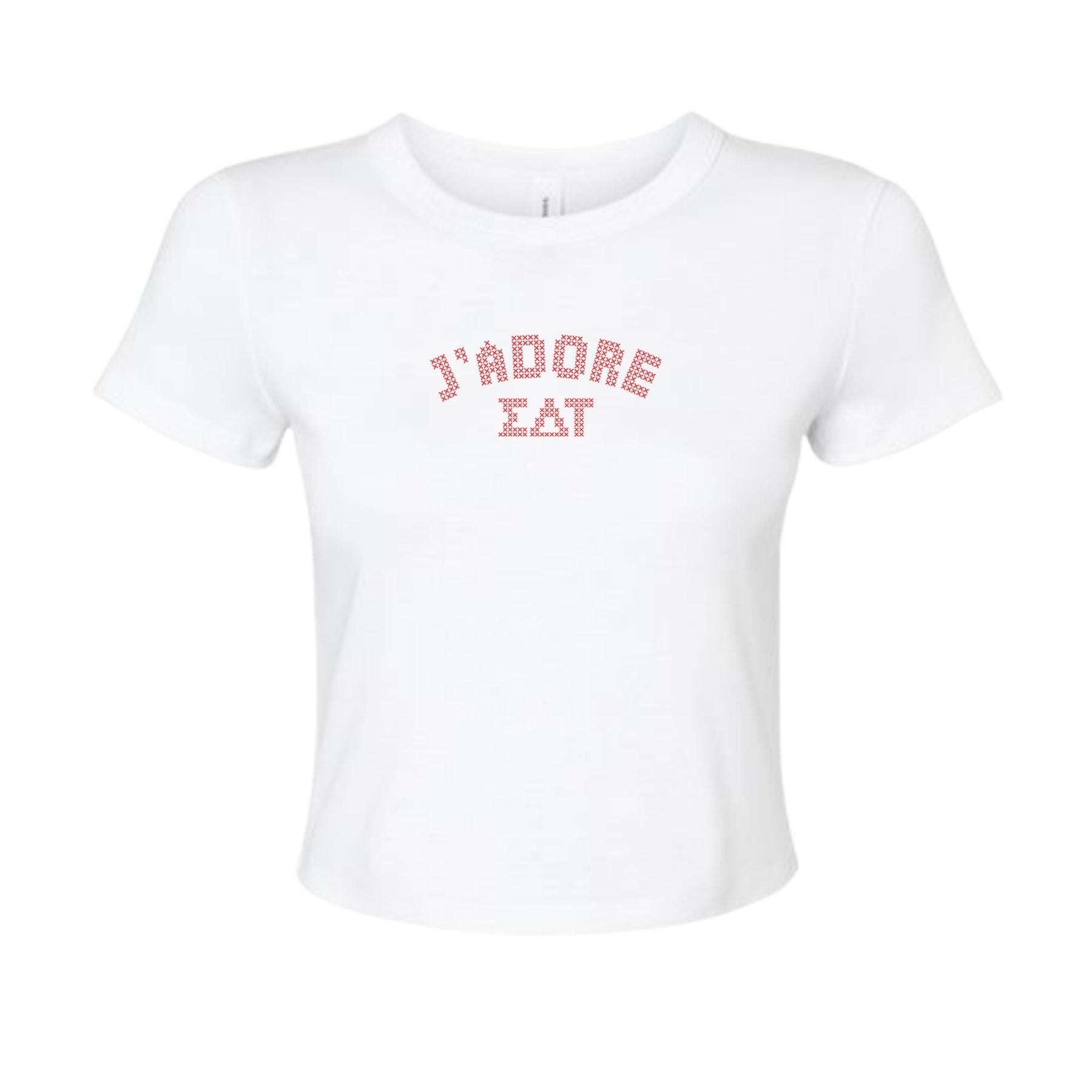 Each sorority design is styled in a playful red cross-stitch pattern (like your grandma’s embroidery, but make it trendy 💌), printed on a cropped baby tee that hugs in all the right places. Perfect for latte runs, Bid Day vibes, or just adding that “je ne sais quoi” to your everyday chapter look.