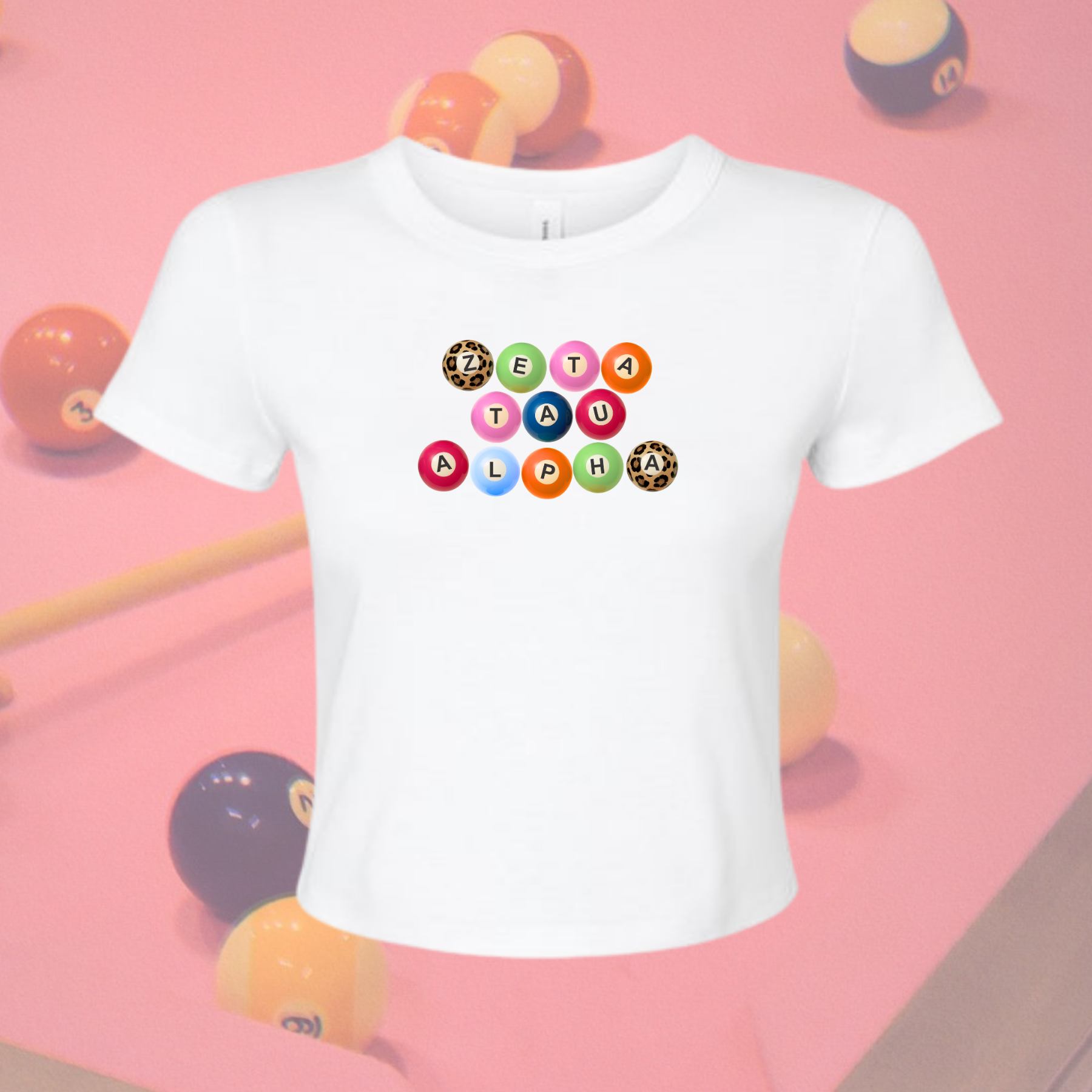 Each letter of your sorority is styled like a playful, vibrant pool ball (yes, including our signature leopard print ones), printed on a super-soft cropped tee made for casual hangs and cute matching moments. Whether you’re styling it with high-waisted denim, rocking it at chapter, or pairing it with joggers for coffee runs, this tee is giving effortless slay.